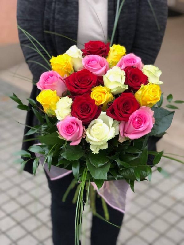 Kytice složená z kvalitních růží v barevném provedení červená, růžová, žluté a bílá doplněné zelení. Doporučuje se volit lichý počet květin. Níže si zvolte možnosti kombinací a doplňkových služeb